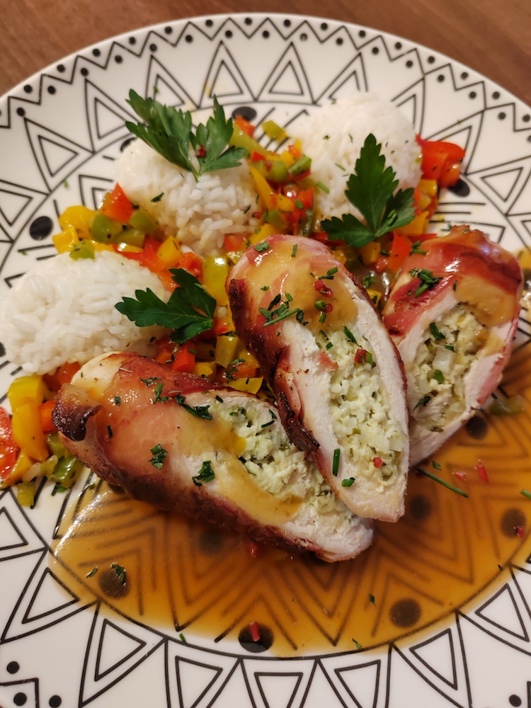 Megtöltjük a reszelt sajttal elkevert túróval, majd szorossan bacon-be göngyöljük. Az így kapott csirkemell hengert alufólia tekerjük, ami úgy fog kinézni, mint a "szaloncukor".
