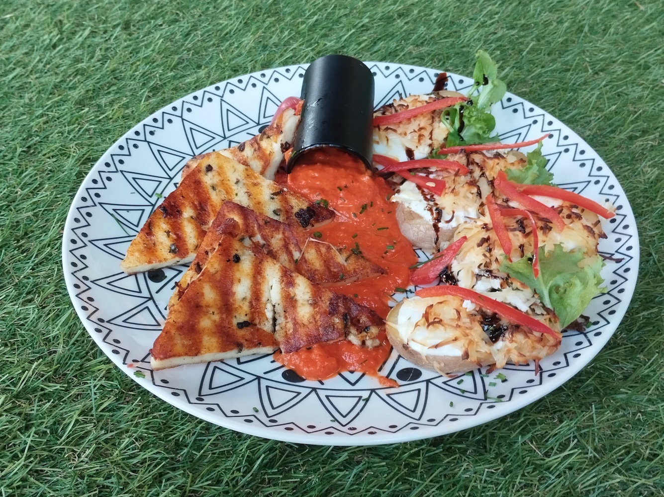 Színes borsos-bazsalikomos grillsajt, füstölt sajttal gratinírozott burgonyakorongokkal és sült kápia paprika krém