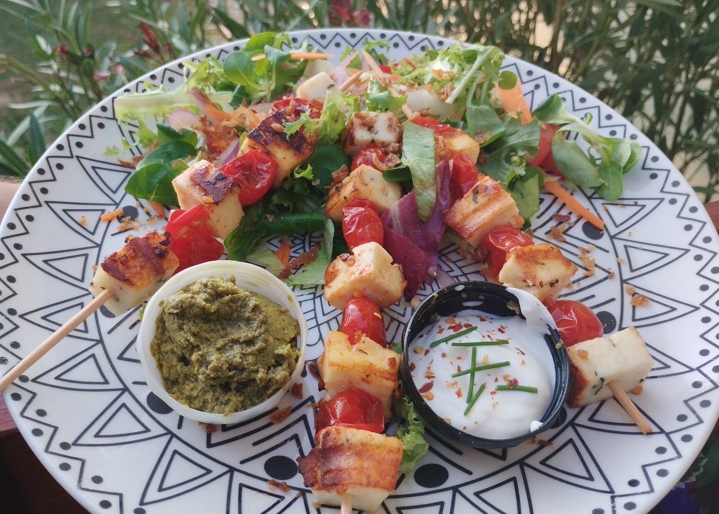 Grillsajt nyárs koktélparadicsommal, friss kevert salátával, zöld pesto és joghurtos fűszeres mártogatóssal