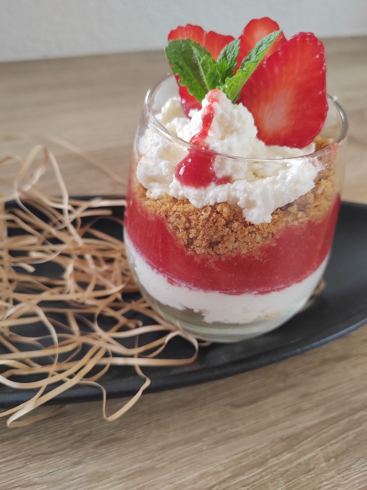 A lehülés után a keksz-túró-eperpép sorrendet követve rétegezzük. Díszítésként friss epret, mentát vagy citromfüvet érdemes használni.