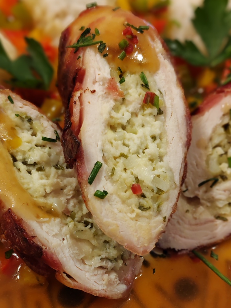 Megtöltjük a reszelt sajttal elkevert túróval, majd szorossan bacon-be göngyöljük. Az így kapott csirkemell hengert alufólia tekerjük, ami úgy fog kinézni, mint a "szaloncukor".