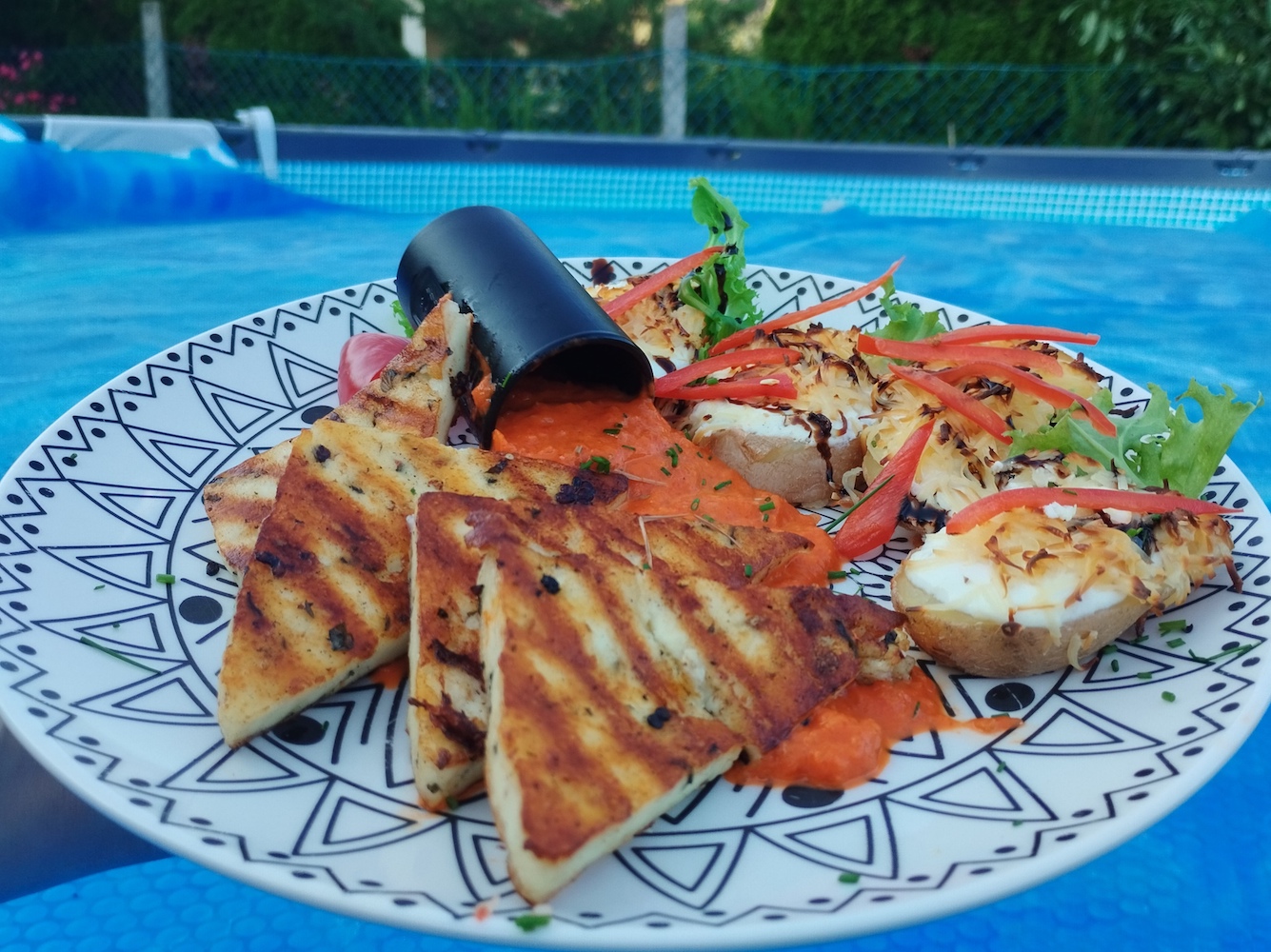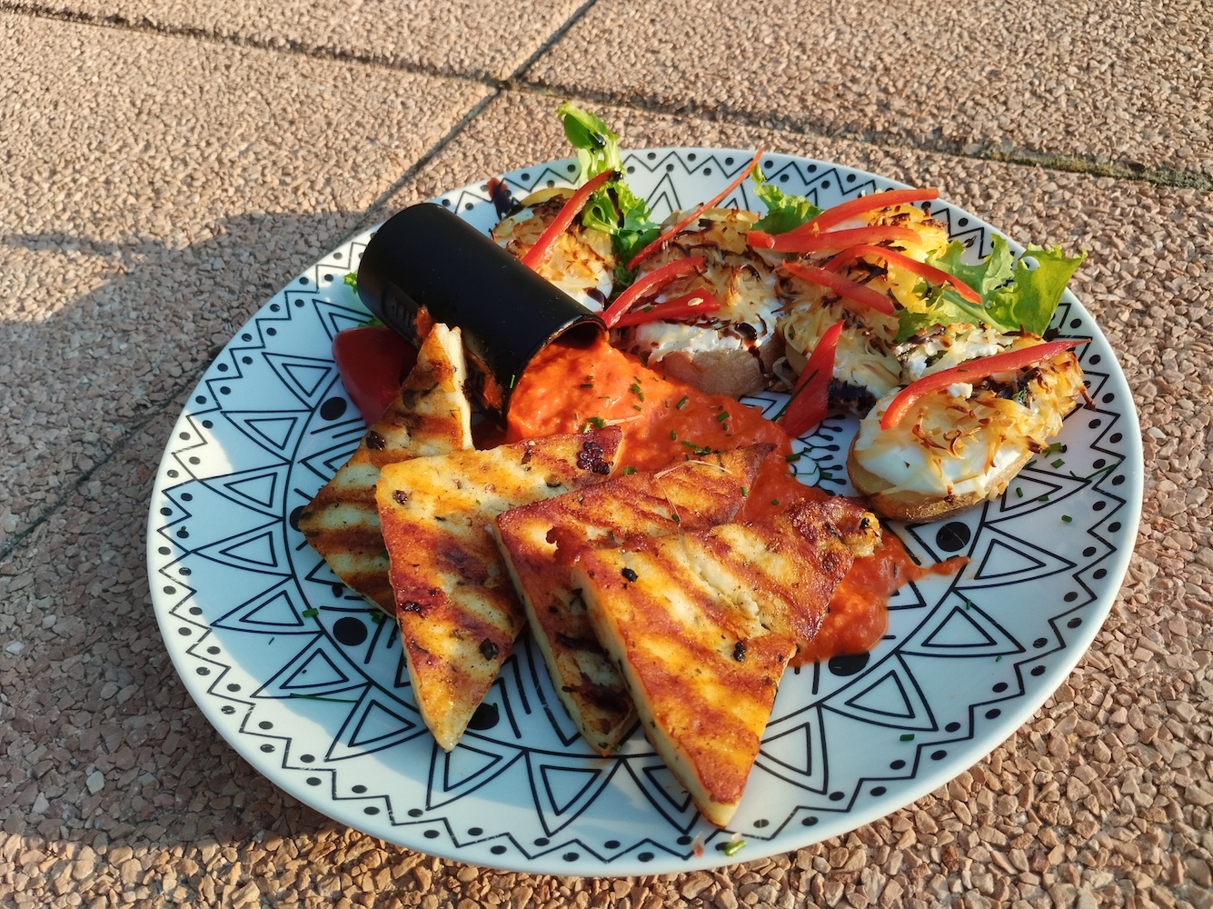 Színes borsos-bazsalikomos grillsajt, füstölt sajttal gratinírozott burgonyakorongokkal és sült kápia paprika krém