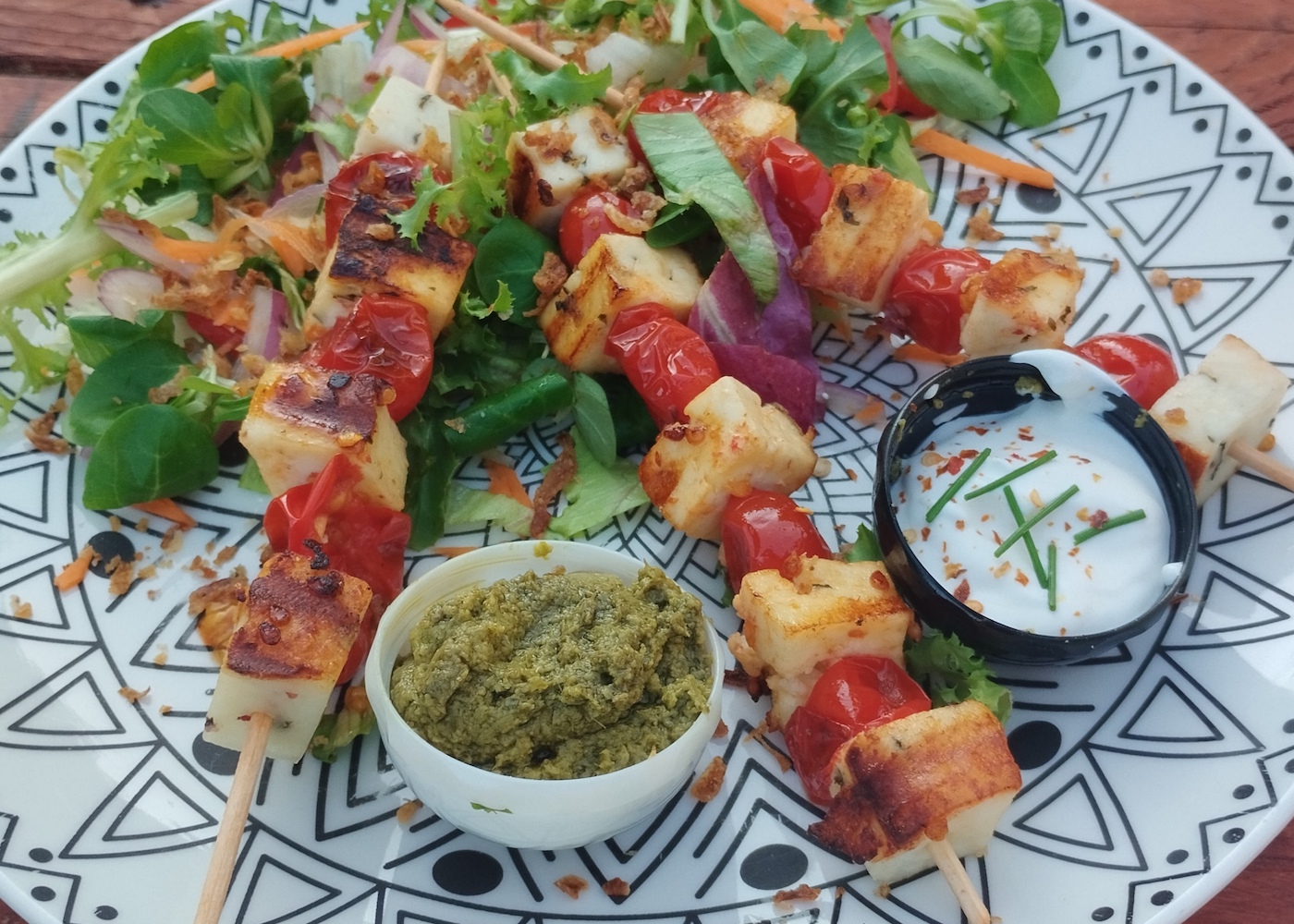 Grillsajt nyárs koktélparadicsommal, friss kevert salátával, zöld pesto és joghurtos fűszeres mártogatóssal