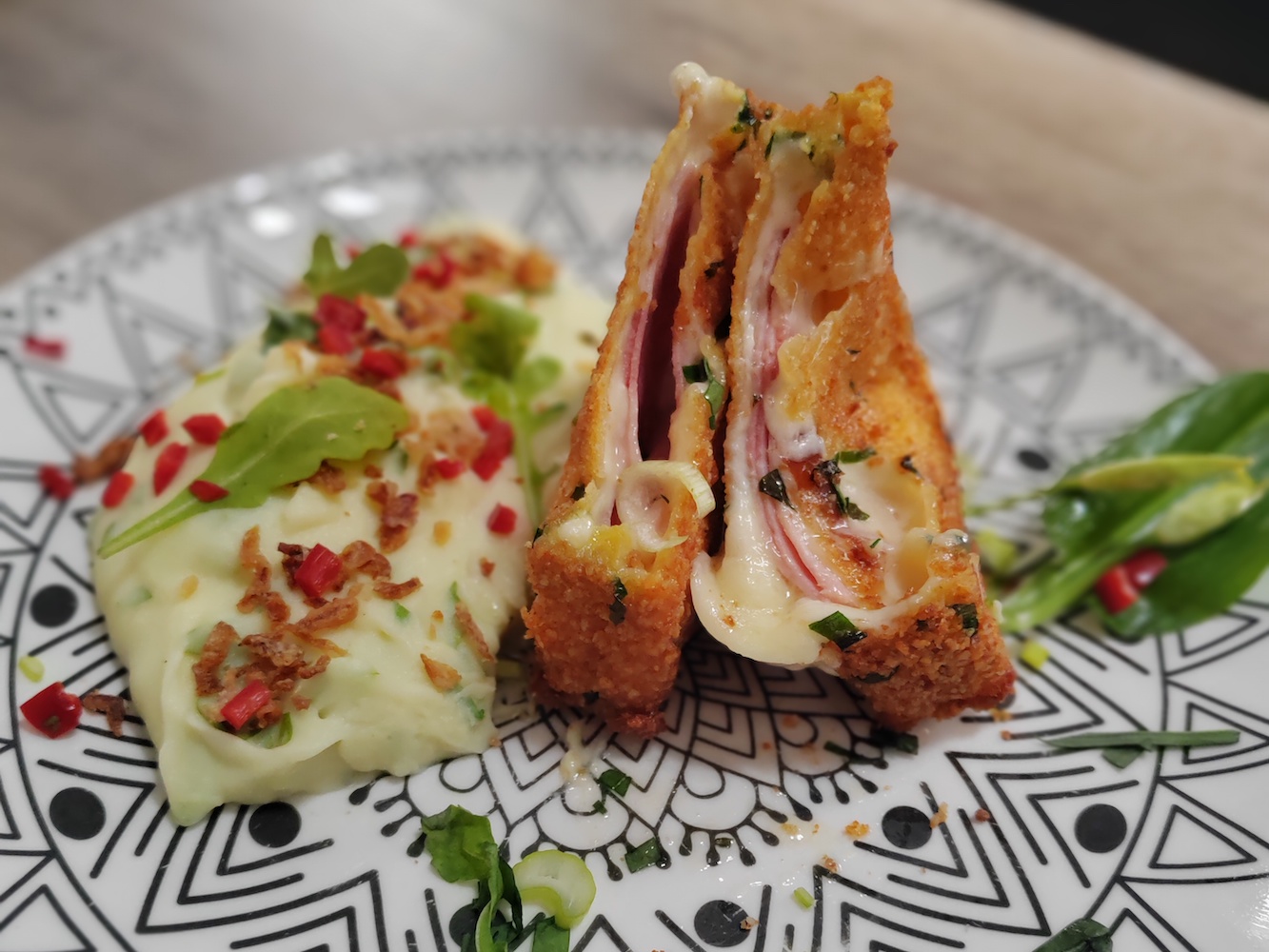 Medvehagymás bundában rántott sajt sonkával töltve, rukkolás burgonyapürével és sült hagymamorzsával